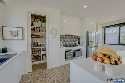 Gourmet kitchen with twin gas/electric ovens, 5-burner gas cooktop, Miele dishwasher, and plumbed fridge.